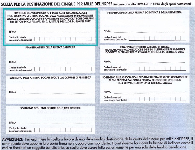 Lo spazio da compilare, come indicato nell’immagini sottostante, è quello intitolato “Sostegno del Volontariato e delle altre Organizzazioni NON lucrative di utilità sociale, delle Associazioni di Promozione Sociale e delle Associazioni e Fondazioni riconosciute che operano nei settori di cui…”